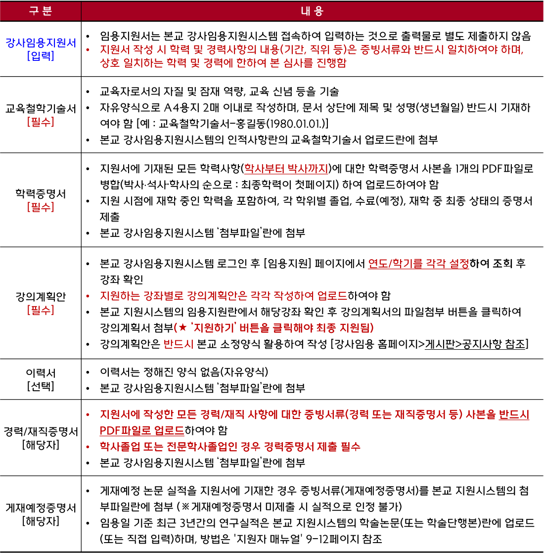 ▶ 지원 시 제출서류 - 본교 강사임용지원시스템에 탑재